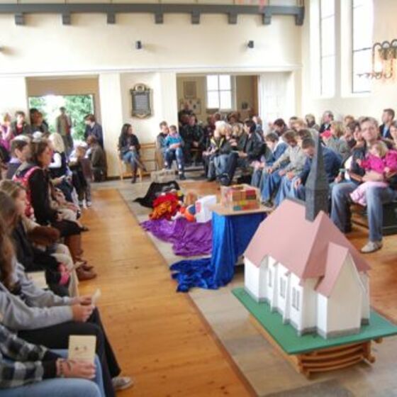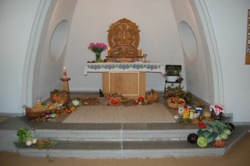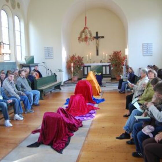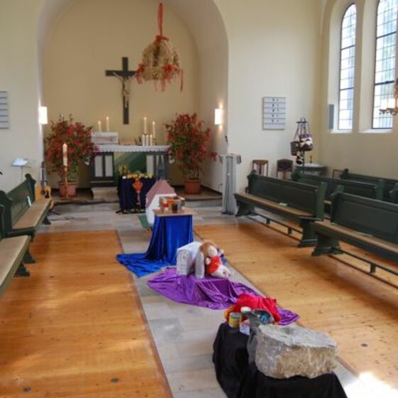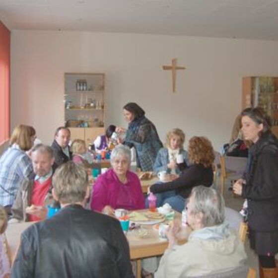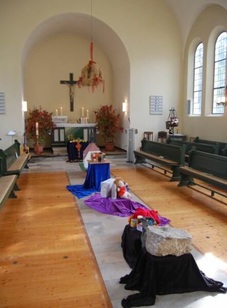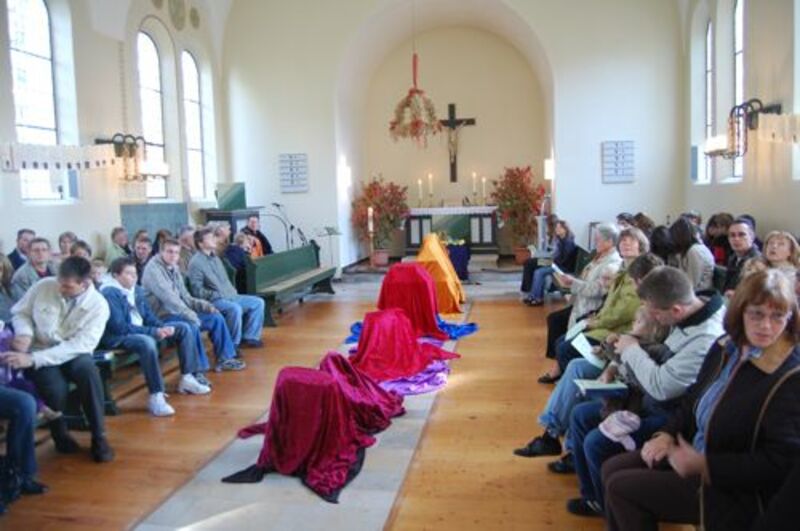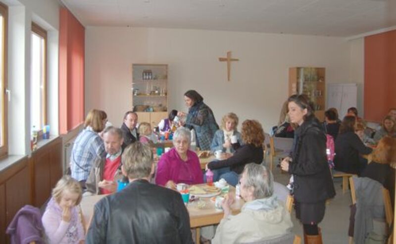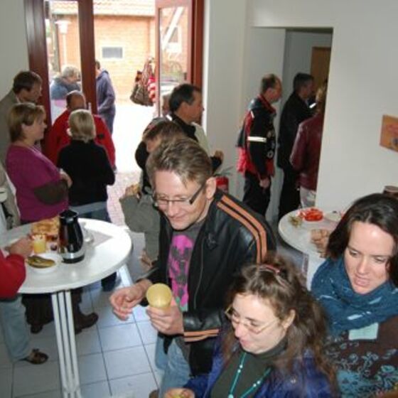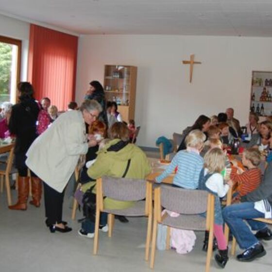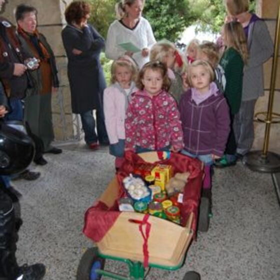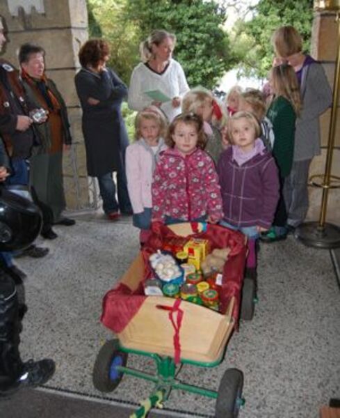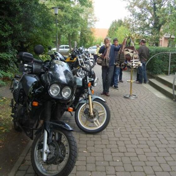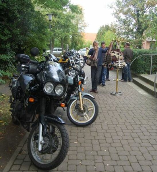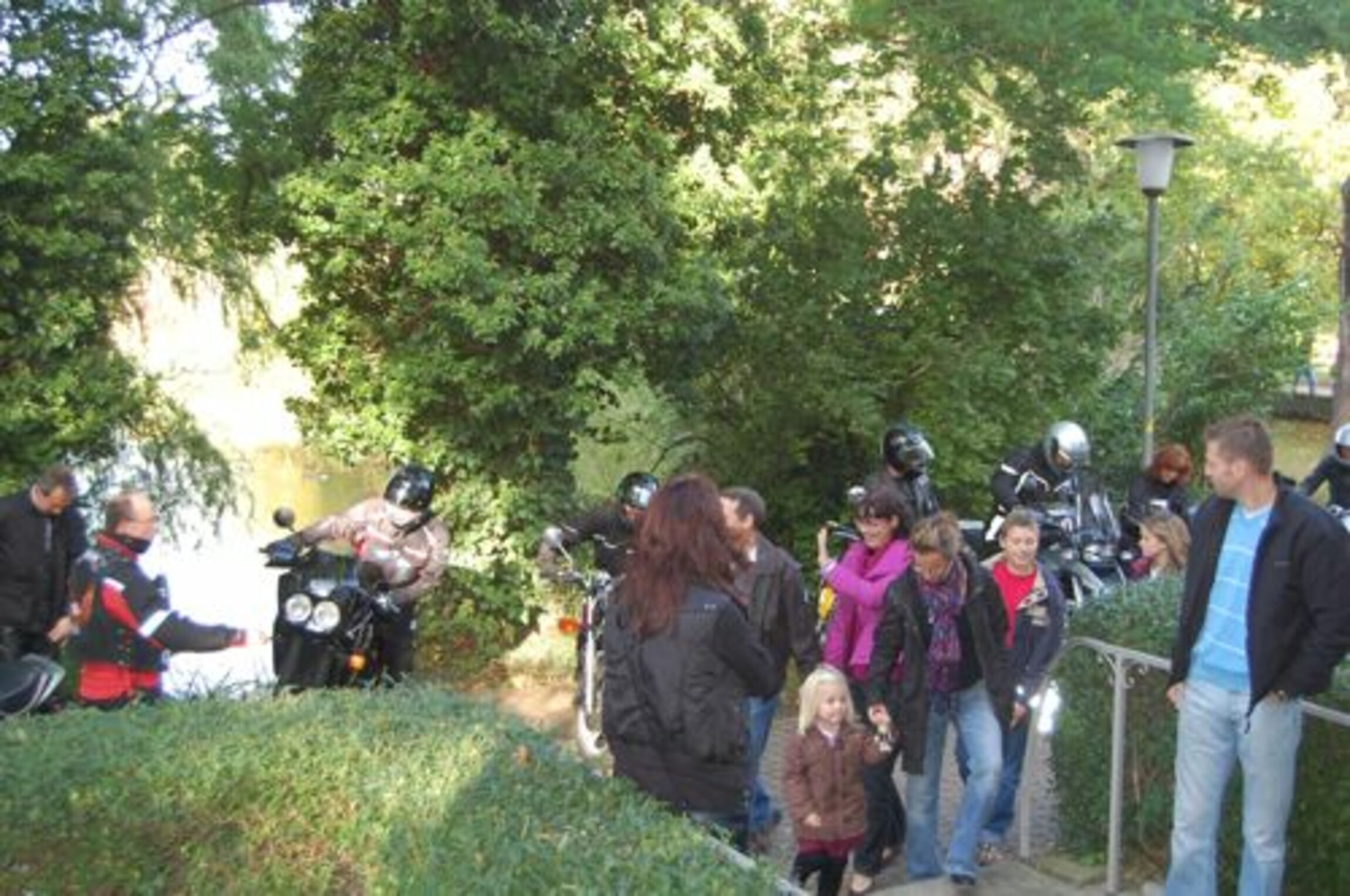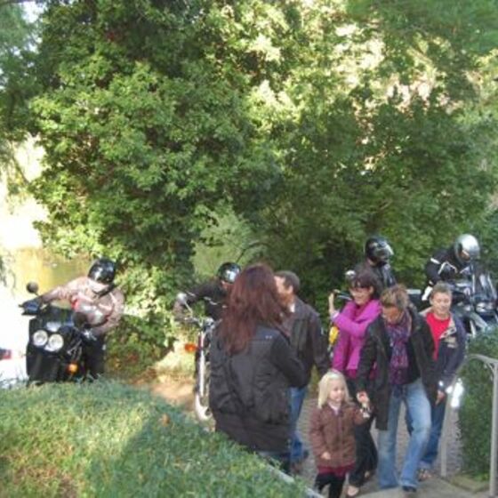 Vor St. Andreas treffen die Besucherinnen und Besucher des Familiengottesdienstes ein - unter ihnen auch viele Mitglieder der Motorradfreunde Harsum, die noch etwas Besionderes im Gepäck haben: einen Scheck über 200,- € - der Erlös vom Motorradgottesdienst für die Regfenbogen Kinderkrippe - Herzlichen Dank dafür!