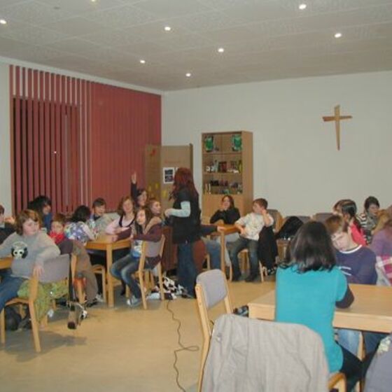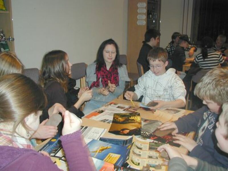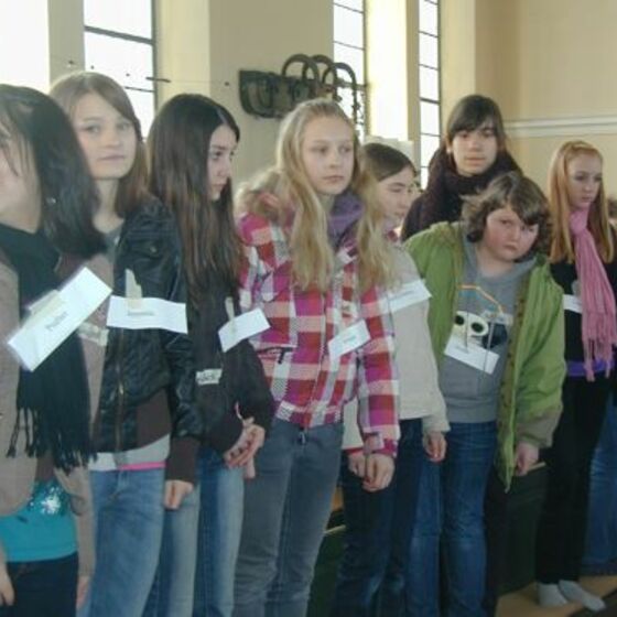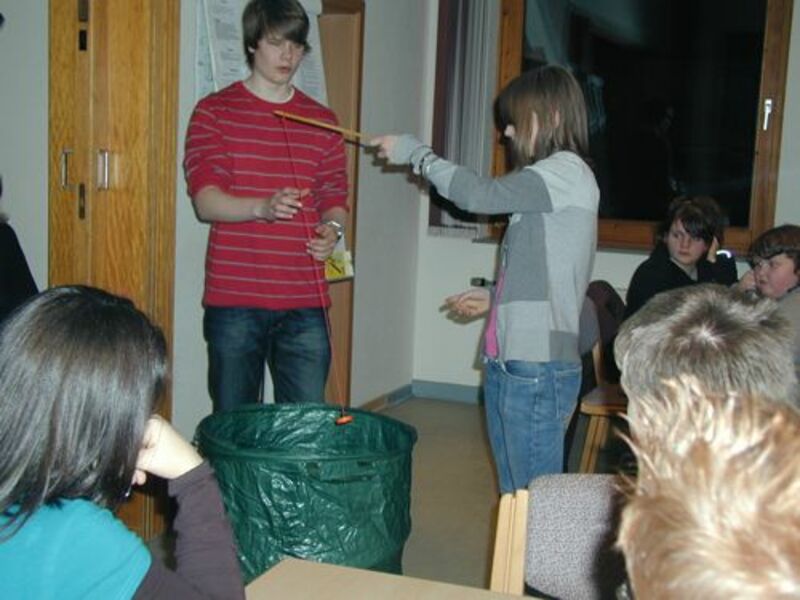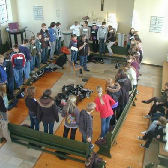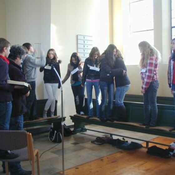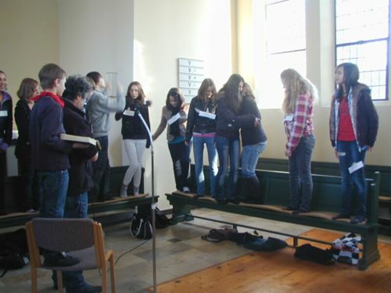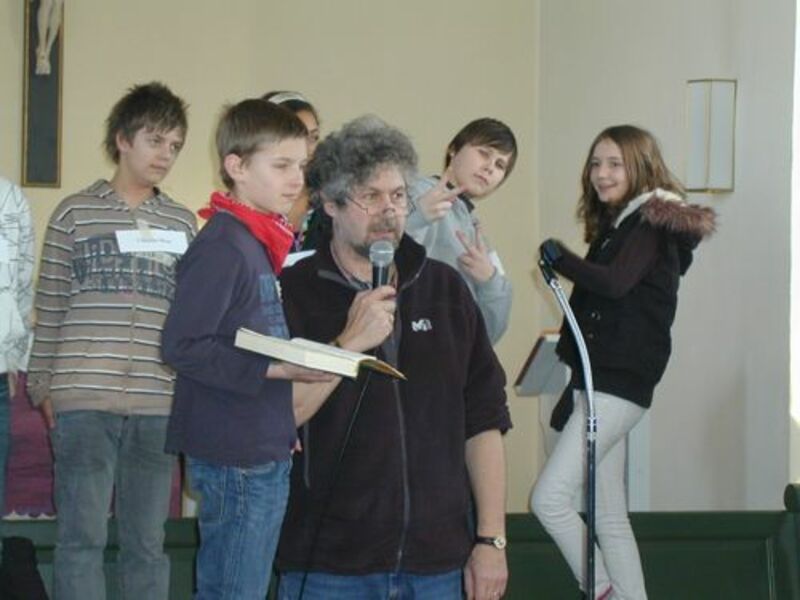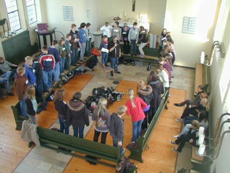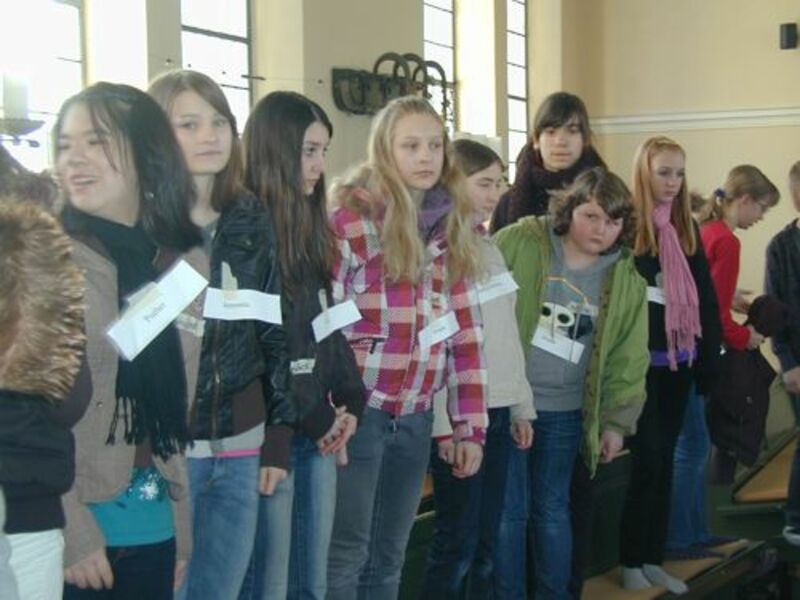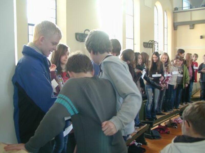 Zu Beginn des Bibel-Wochenendes ging es erst mal darum, einen Überblick zu gewinnen. Und das auf spielerische Weise. Allen wird ein biblisches Buch zugewiesen. So sind dann 34 biblische Bücher sind in unserer Kirche versammelt - leider völlig durcheinander. 1. Samuel neben Markus - das geht nicht. Julian bringt dann Ordnung in das Chaos.