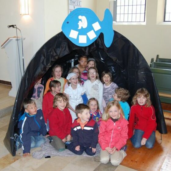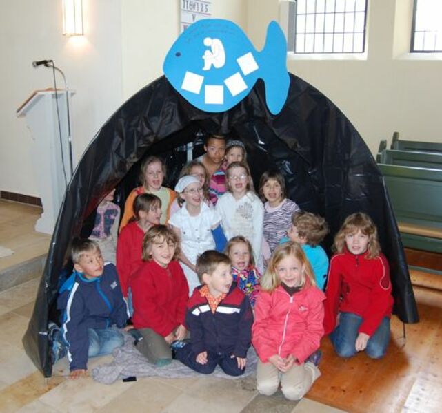 Danach ging es um die Geschichte des Propheten Jona, die vorher im Kindergottesdienst Thema gewesen war. Jona flieht vor der Aufgabe, die Gott ihm stellt und findet sich alsbald im Bauch eines Walfisches wieder.