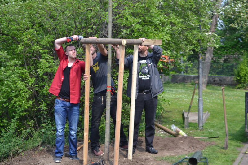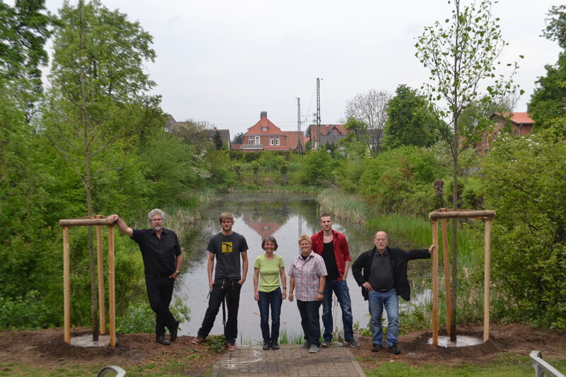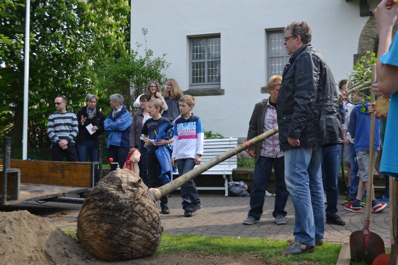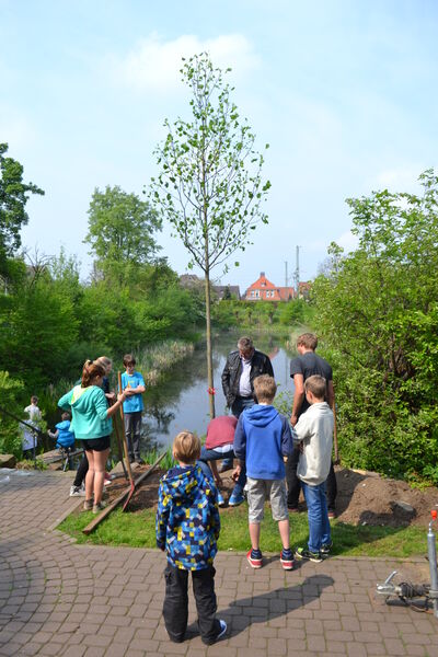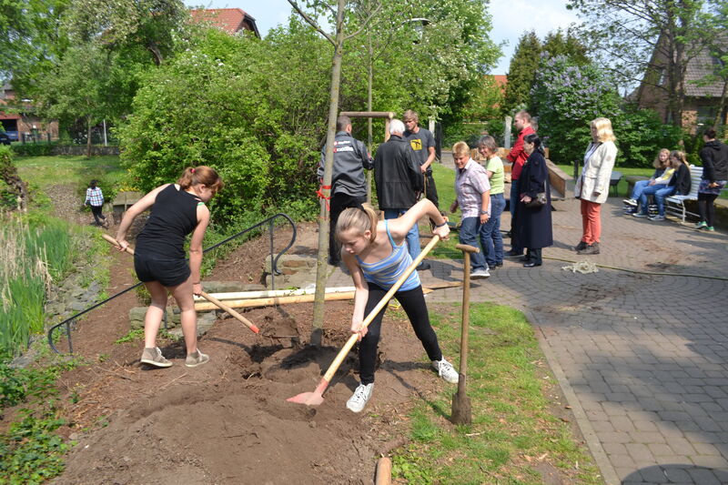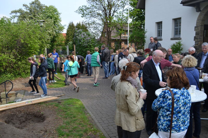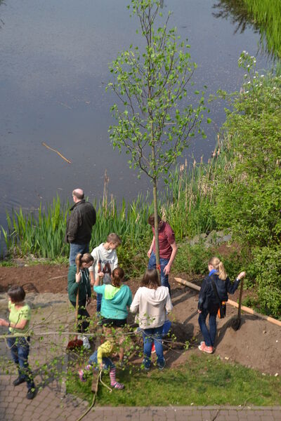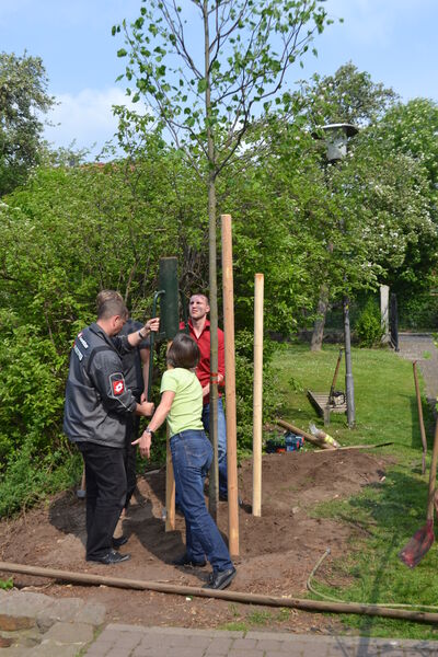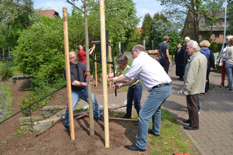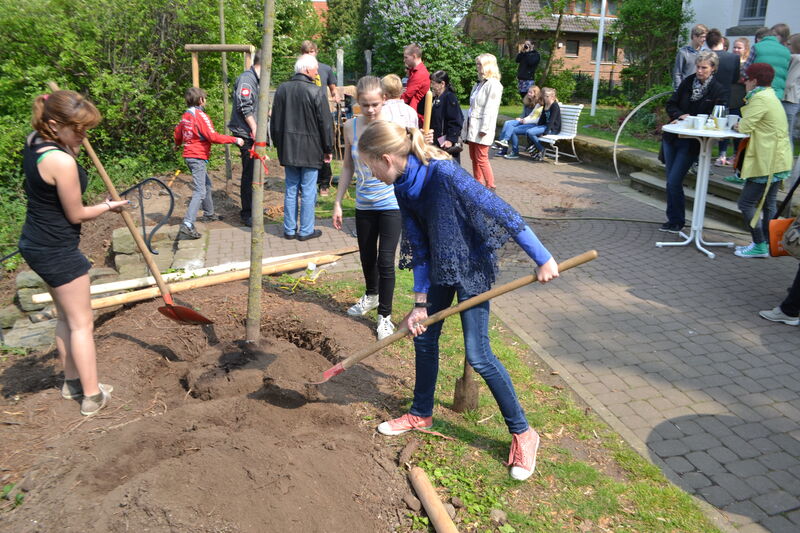 Unter großer Beteiligung der Gemeinde wurden am Sonntag Quasimodogeniti am 27. April zwei neue Bäume am Kirchteich gepflanzt. Die beiden Robinien, die dort seit fast 100 Jahren standen, waren so morsch, dass sie ein Sicherheitsrisiko darstellten und gefällt werden mussten. Nun wurden sie ersetzt durch zwei Bäume der Sorte Magnolia. Unsere Kirchenvorstandsvorsitzende Susanne Bräuer hatte dazu in der Halokaz geschrieben: Ein Baum ist ja immer auch ein Geschenk an kommende Generationen und dokumentiert zugleich unseren Glauben an eine lebenswerte Zukunft, in die wir mit Zuversicht blicken. Einige Konfirmanden und Mitarbeiter hatten am Vortag beim Konfi-Wochenende unter vielen Mühen die Pflanzlöcher gegraben. Nun konnte Herr Rathai die Bäume mit Hilfe der Anwesenden setzen und befestigen. Konfirmand Jake Piles las dazu den Psalm 1 vor: ...der ist gepflanzt wie ein Baum an Wasserbächen. In einigen Jahren werden uns hoffentlich die wunderschönen Blüten der Bäume erfreuen können. Viele nutzten die Möglichkeit, gegen eine Spende von 10 Euro zu Baumpaten zu werden, um so zu helfen, die Kosten von ca. 700 Euro zu finanzieren. Entsprechende Formulare liegen in der Kirche aus.