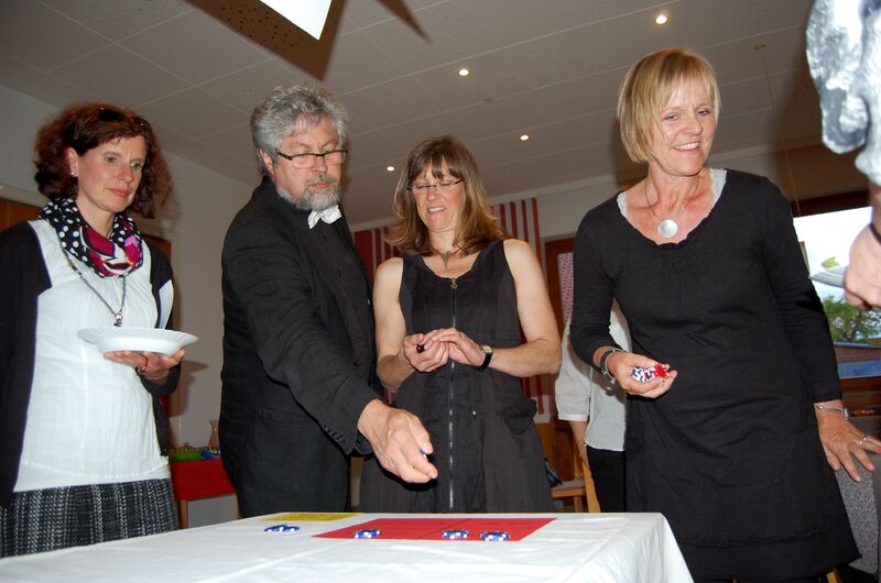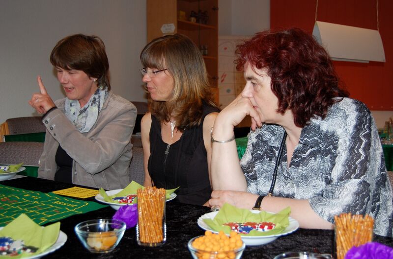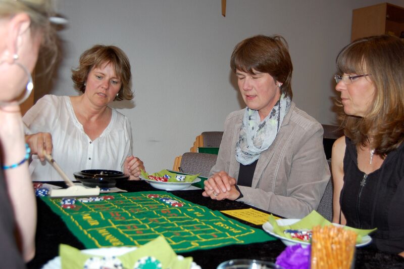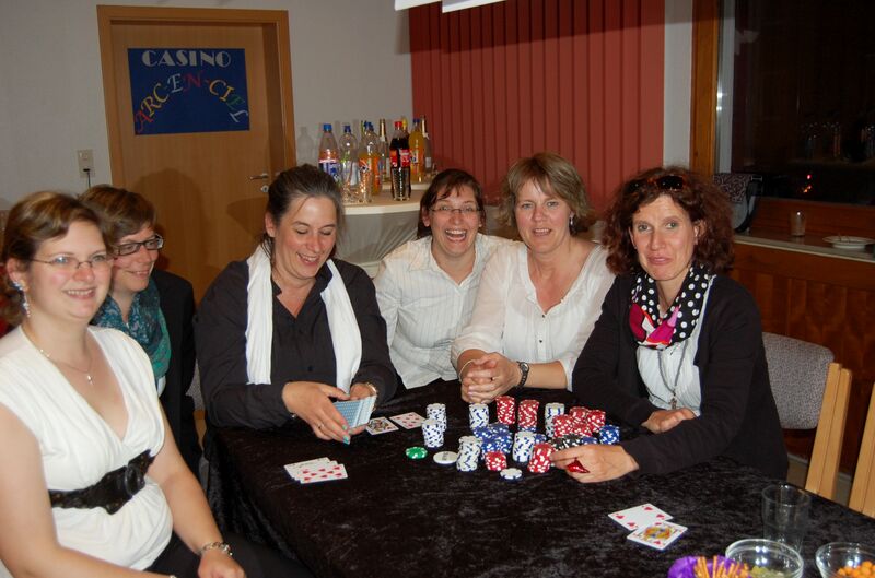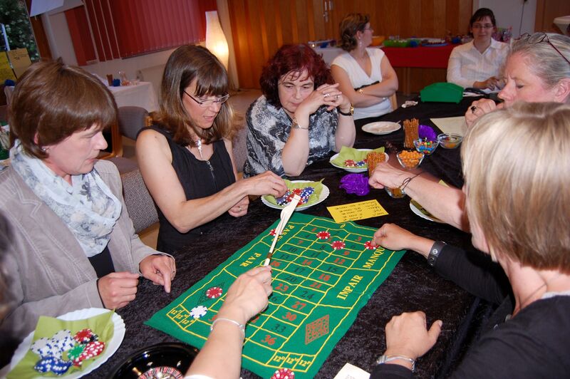 Zu einem Casino-Abend hat der Elternbeirat die Erzieherinnen unseres Kindergartens eingeladen als Dank für ihr Engagement. Aufwendig wurde der große Raum in unserem Gemeindehaus hergerichtet. Für Poker, Roulette, Würfelspiel und Blackjack wurden Spieltische eingerichtet. Einen Teller voller Chips bekam jede Erzieherin zu Beginn ausgehändigt und konnte damit ihre Einsätze bestreiten. Die Chefin räumte natürlich beim Poker dermaßen ab, dass sie einen uneinholbaren Vorsprung hatte - bis sie beim Blackjack alles verlor. Aber sonst war es ein sehr schöner Abend, der allen Beteiligten viel Spaß gemacht hat.