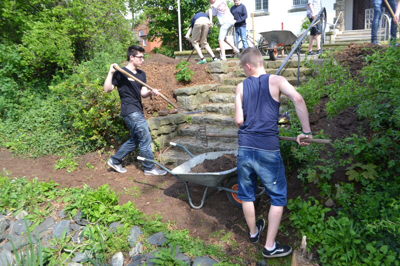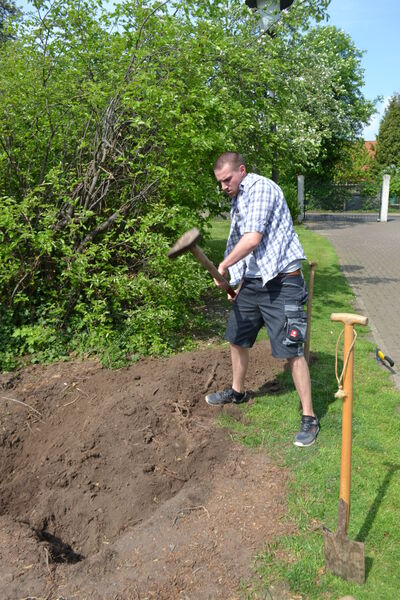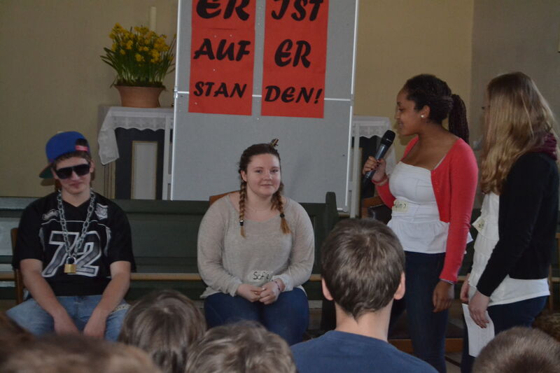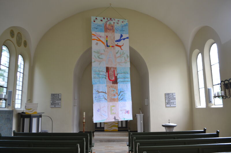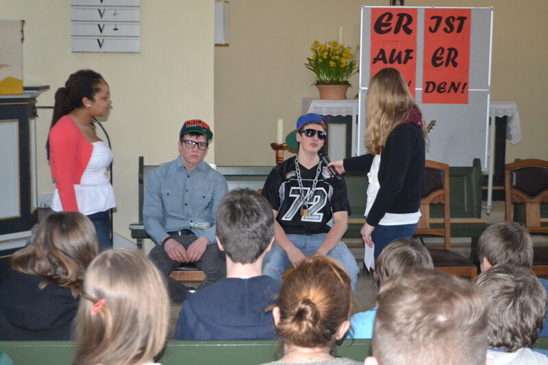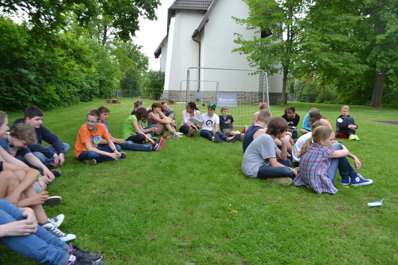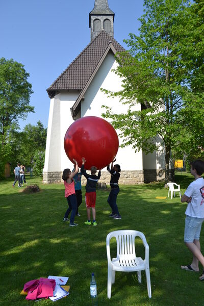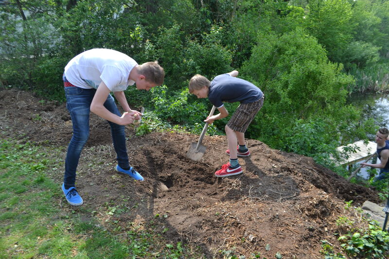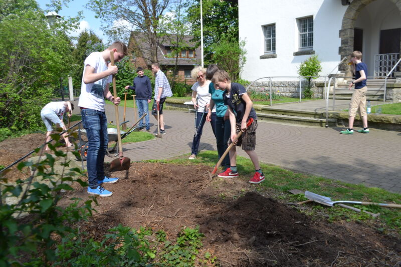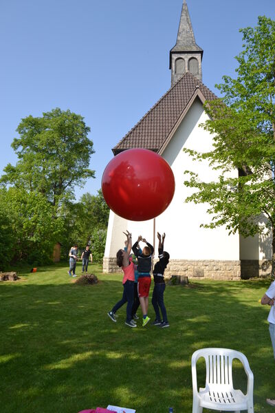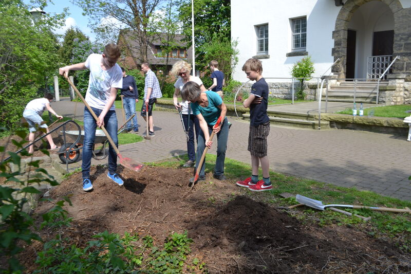 Beim letzten Konfi-Wochenende ging es für die Vorkonfirmanden um den christlichen Glauben. Nach dem Ankommen konnten sie sich beim Rippeltippelspiel mit schwarzen Punkten verschönern lassen. Abends hatten dann die Mitarbeitenden eine Glaubenstalkshow vorbereitet. Sie spielten Jugendliche in verschiedenen kulturellen Orientierungen und wurden auf ihr Haltung zum Glauben befragt. Am Samstagvormittag gab es acht Stationen, in denen die Konfis Erfahrungen machen konnten, die sich auf den Glauben beziehen. Am Nachmittag gestalteten sie ein großes Baumbild für den Gottesdienst. Jede Gruppe bekam ein Buchstaben aus dem Wort "Glaube" und musste dazu Begriffe finden, die zum Glauben gehören. In der Predigt gab es dann im Gottesdienst Erläuterungen dazu. Die Kräftigsten der Konfirmanden halfen dabei, die Pflanzlöcher für die beiden Bäume zu graben, die am Sonntag gepflanzt werden sollten.
