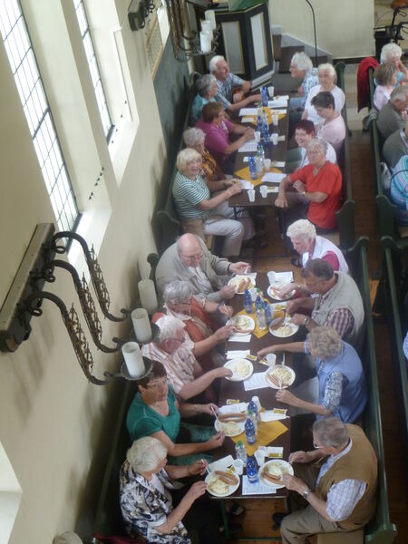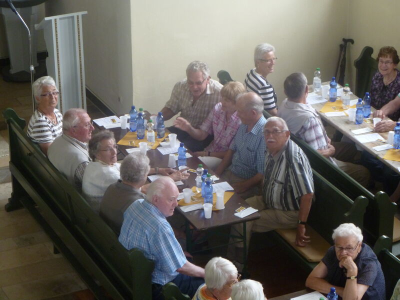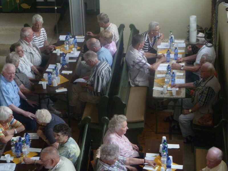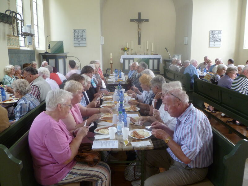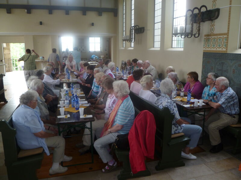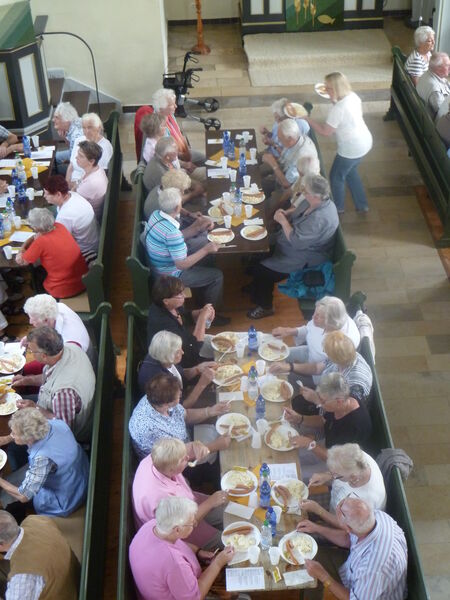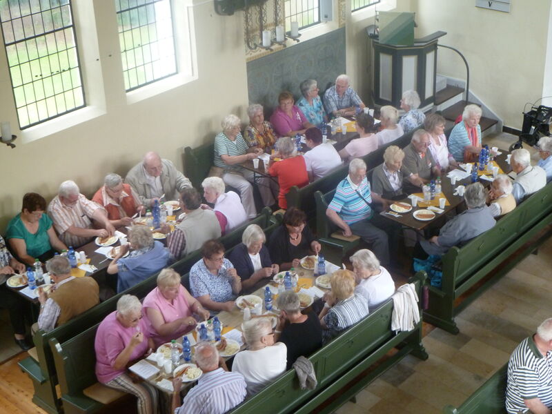 Bei sonnigem Wetter holten zwei Busse die Seniorinnen und Senioren aus Asel, Bavenstedt und Harsum zum Ausflug zu einem Gutshof-Café in Rethmar ab. Eine gewaltige ehemalige Scheune bot genug Platz zum gemütlichen Kaffeetrinken. Danach lockte der Englische Garten des Gutshofes mit seinen riesigen Bäumen und bunten Sträuchern zum Spazierengehen. Viele sezten sich auch an den kleinen Teich und sahen den Goldfischen zu, die sich immer wieder neu versammelten. "Guck mal, genau wie bei uns - der große Schwarm ist Harsum, der mittlere ist Asel und der kleine ist Bavenstedt," so wurde das gedeutet, was man im Wasser beobachten konnte. Der Ausflug endete wieder mit einem gemeinsamen Abendbrotessen in unserer St. Andreas Kirche. Hier hatten die Vertrauensfrauen Tische und Bänke zu einer großen Tafel aufgestellt. Statt der sonst üblichen warmen Suppe wurde Kartoffelsalat und Würstchen serviert - warm genug war es ja an diesem schönen Tag. Einen großen Applaus gab es für die Vertrauensfrauen, die diesen Ausflug wieder so schön vorbereitet hatten.